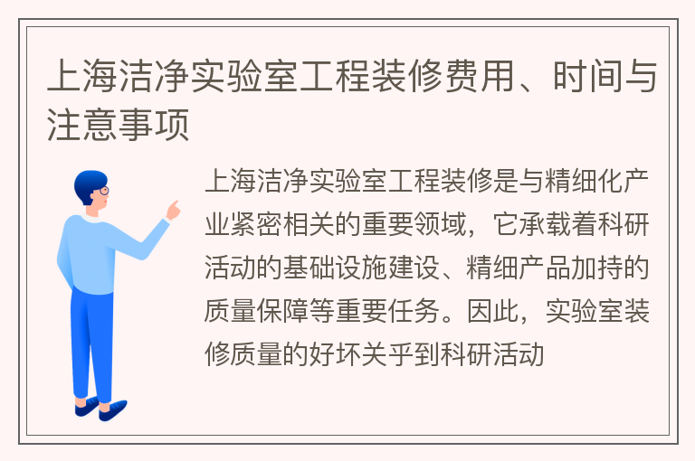 作为一个拥有发达科技的城市,上海近年来的电子、半导体等产业发展迅猛,而这些行业的核心地方——洁净实验室也日益普及。对于开设或改造洁净实验室的投资者来说,时间管理一般是首要要考虑的问题之一。本文将详细介绍上海洁净实验室工程装修所需时间,以便投资者进行相应的安排。