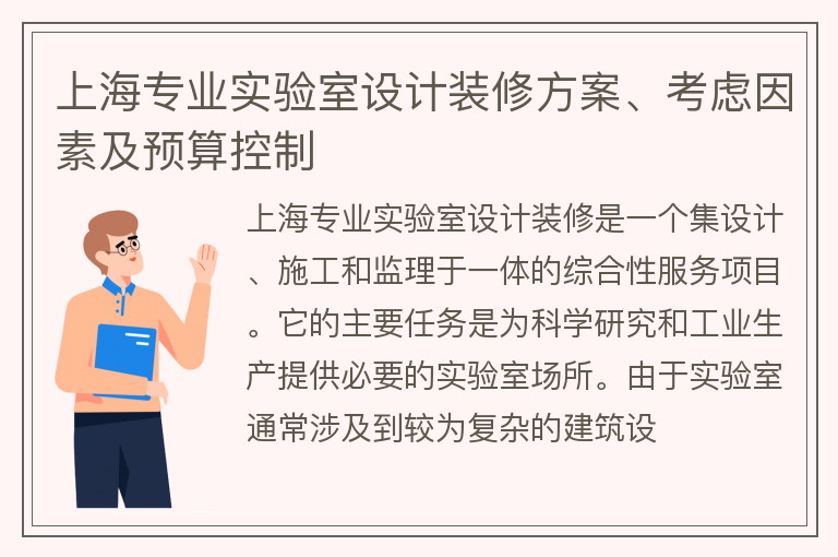 随着科技的不断发展,实验室在各个领域中扮演着越来越重要的角色,而实验室装修设计方案的合理性和规范性就显得尤为重要。本文将针对上海专业实验室设计装修方案的制定进行详细阐述,旨在帮助读者深入了解相关知识,为实验室建设提供指导。