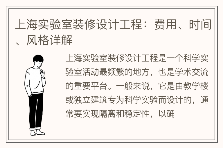 实验室装修费用的高低与实验室使用的设备、材料、技术要求、环境条件等因素有关。在上海,实验室装修多么贵?如果您有类似的疑问,请静心阅读下文。
