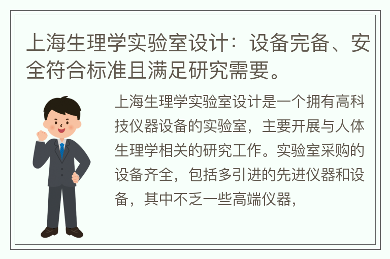 上海生理学实验室设计是一个拥有高科技仪器设备的实验室,主要开展与人体生理学相关的研究工作。实验室采购的设备齐全,包括多引进的先进仪器和设备,其中不乏一些高端仪器,这为科学家们开展实验提供了优越的条件。