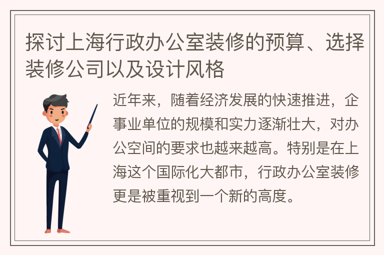 在办公室装修的过程中,预算一直是一个很重要的问题。对于一些小型企业及初创公司来说,预算不高的情况下如何做好办公室装修也一直是一个难题。今天我们就来探讨一下在上海地区行政办公室装修需要多少预算。