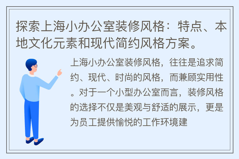 办公室是一个人们工作、交流的场所,其环境和氛围都会影响办公效率和员工的心态,因此办公室装修需要注重细节。随着小型办公室的快速发展,装修风格也时常变化。而在上海,小型办公室的装修风格更是有着独特的特点,下面就让我们来一探究竟。