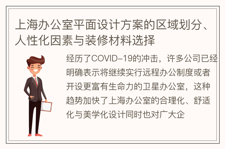 经历了COVID-19的冲击,许多公司已经明确表示将继续实行远程办公制度或者开设更富有生命力的卫星办公室,这种趋势加快了上海办公室的合理化、舒适化与美学化设计同时也对广大企业的办公空间提供了前所未有的机遇。