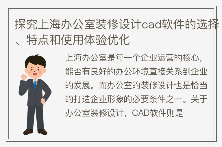 办公室在当今职场中已经变得越来越重要,一个好的办公室装修不仅可以提升员工舒适度,也可以提高工作效率和创造力。而对于装修设计来说,常用的cad软件可以使得设计更加精确和高效。但面对众多的cad软件和设计师,如何选择一款优秀的cad软件成为了很多公司的关注点。本文将从多个角度介绍如何选择适合您的上海办公室装修设计cad软件。