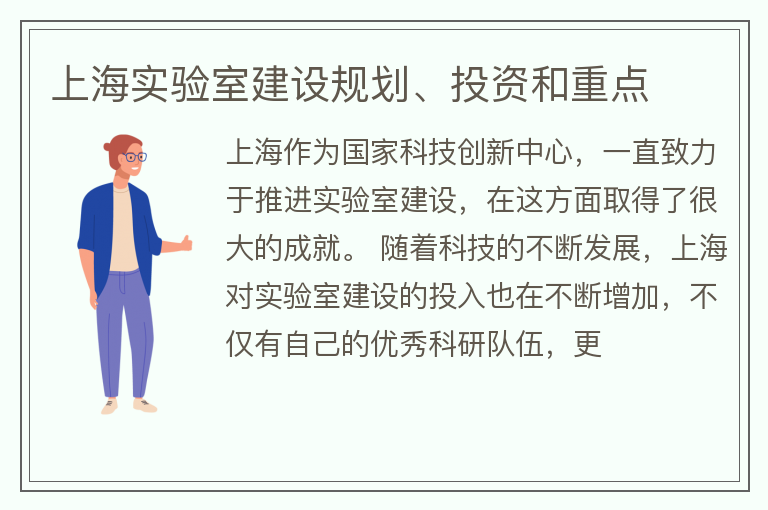 随着科技的不断发展,上海对实验室建设的投入也在不断增加,不仅有自己的优秀科研队伍,更有一流的设施和前沿技术,使得上海的实验室建设水平不断提高,并在国内处于领先地位。