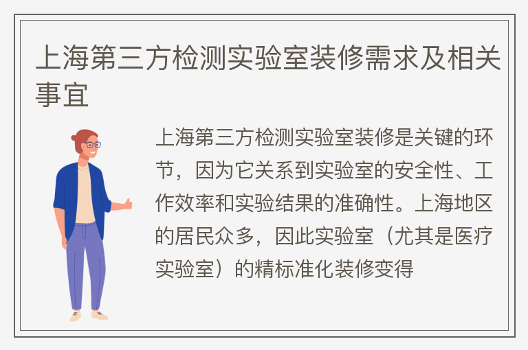 随着现代科技的不断发展,越来越多的实验室被建立,一些企业和机构也纷纷开始了自己的实验室工作。实验室装修是实验室建设中非常重要的一个环节,其中第三方检测实验室装修更是需要极高的要求。下面就让我们来看看上海第三方检测实验室的装修需求。