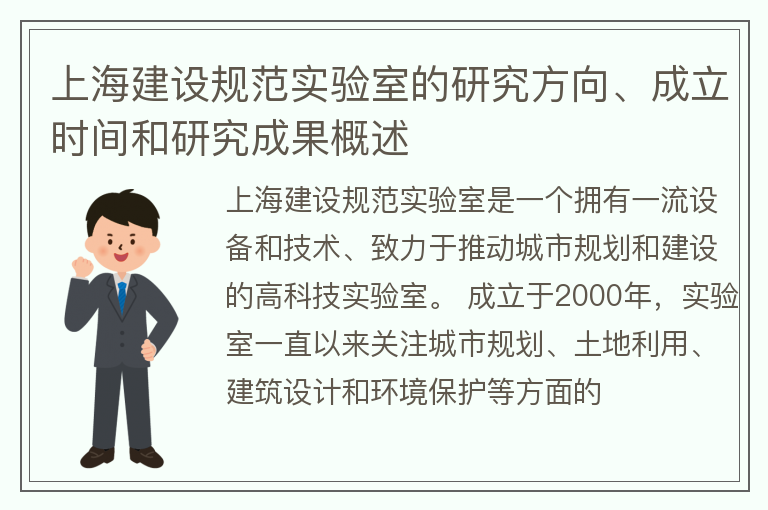 上海建设规范实验室是一个拥有一流设备和技术、致力于推动城市规划和建设的高科技实验室。
