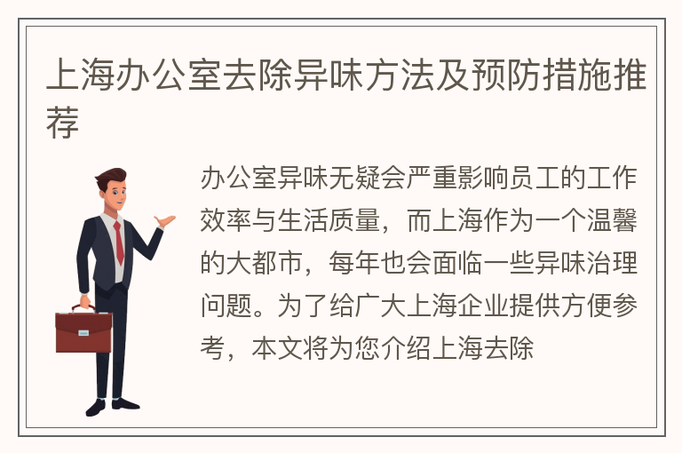 办公室异味无疑会严重影响员工的工作效率与生活质量,而上海作为一个温馨的大都市,每年也会面临一些异味治理问题。为了给广大上海企业提供方便参考,本文将为您介绍上海去除办公室异味的方法与技巧,希望对您有所帮助。