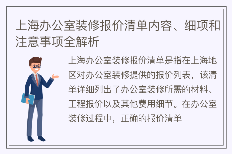 上海办公室装修报价清单是指在上海地区对办公室装修提供的报价列表,该清单详细列出了办公室装修所需的材料、工程报价以及其他费用细节。在办公室装修过程中,正确的报价清单......【点击详情】