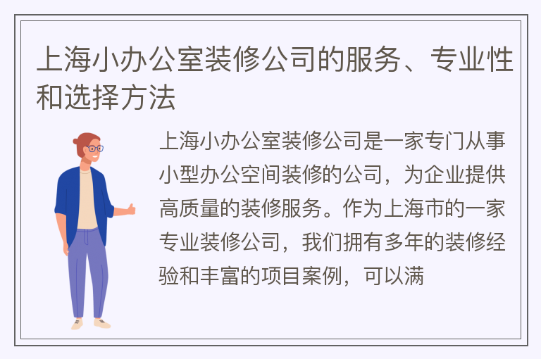 上海小办公室装修公司是一家专门从事小型办公空间装修的公司,为企业提供高质量的装修服务。作为上海市的一家专业装修公司,我们拥有多年的装修经验和丰富的项目案例,可以满......【点击详情】