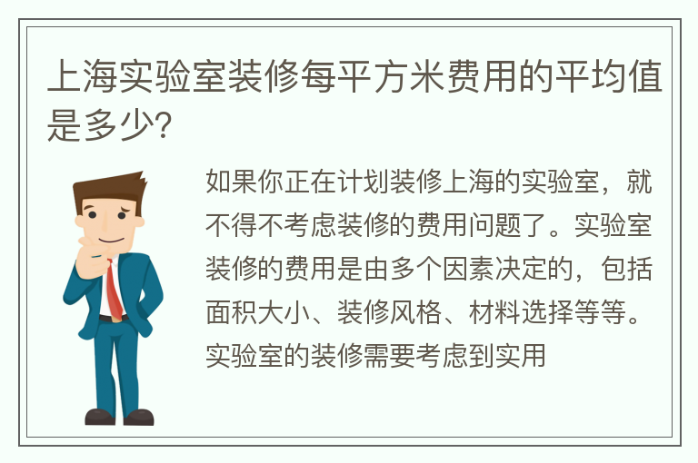 如果你正在计划装修上海的实验室,就不得不考虑装修的费用问题了。实验室装修的费用是由多个因素决定的,包括面积大小、装修风格、材料选择等等。实验室的装修需要考虑到实用......【点击详情】