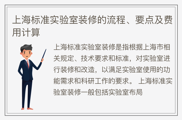 上海标准实验室装修是指根据上海市相关规定、技术要求和标准,对实验室进行装修和改造,以满足实验室使用的功能需求和科研工作的要求。 上海标准实验室装修一般包括实验室布局......【点击详情】