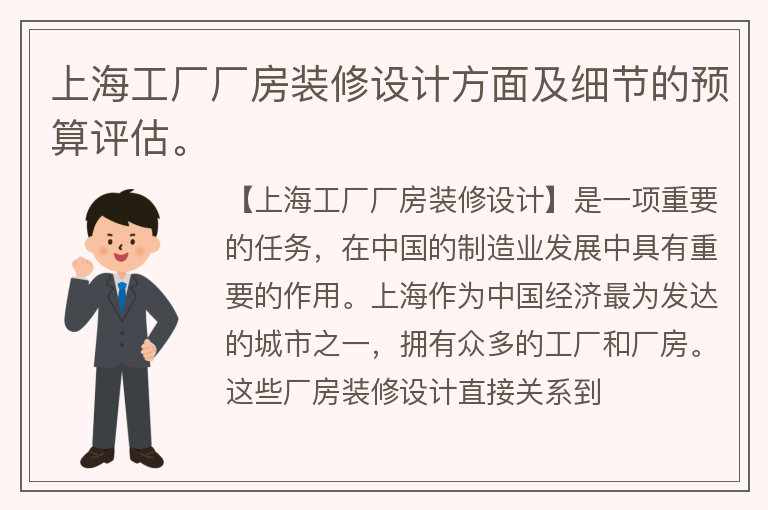 【上海工厂厂房装修设计】是一项重要的任务,在中国的制造业发展中具有重要的作用。上海作为中国经济最为发达的城市之一,拥有众多的工厂和厂房。这些厂房装修设计直接关系到......【点击详情】