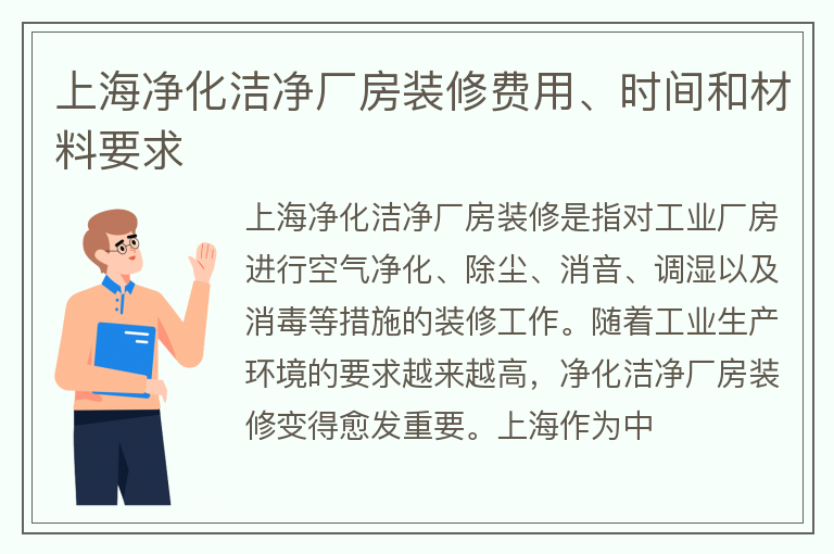 上海净化洁净厂房装修是指对工业厂房进行空气净化、除尘、消音、调湿以及消毒等措施的装修工作。随着工业生产环境的要求越来越高,净化洁净厂房装修变得愈发重要。上海作为中......【点击详情】