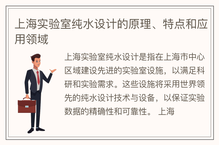 上海实验室纯水设计是指在上海市中心区域建设先进的实验室设施,以满足科研和实验需求。这些设施将采用世界领先的纯水设计技术与设备,以保证实验数据的精确性和可靠性。 上海......【点击详情】