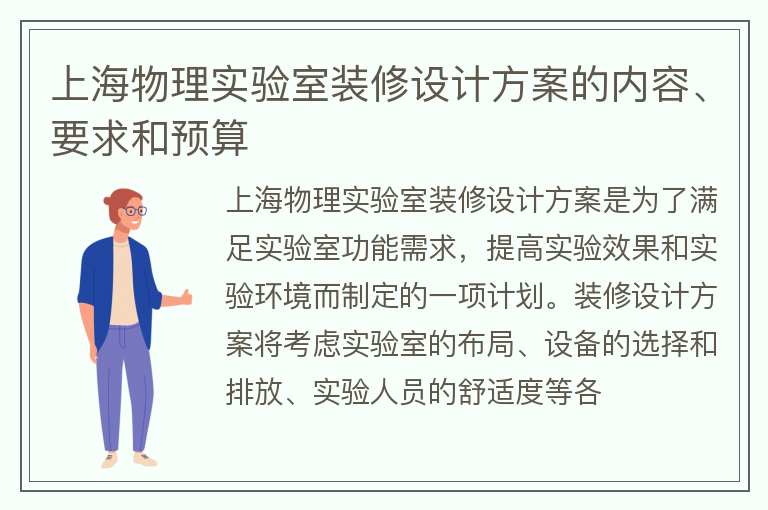 上海物理实验室装修设计方案是为了满足实验室功能需求,提高实验效果和实验环境而制定的一项计划。装修设计方案将考虑实验室的布局、设备的选择和排放、实验人员的舒适度等各......【点击详情】