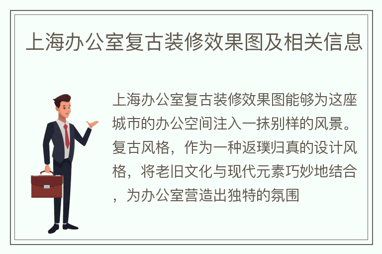 上海办公室复古装修效果图能够为这座城市的办公空间注入一抹别样的风景。复古风格,作为一种返璞归真的设计风格,将老旧文化与现代元素巧妙地结合,为办公室营造出独特的氛围......【点击详情】