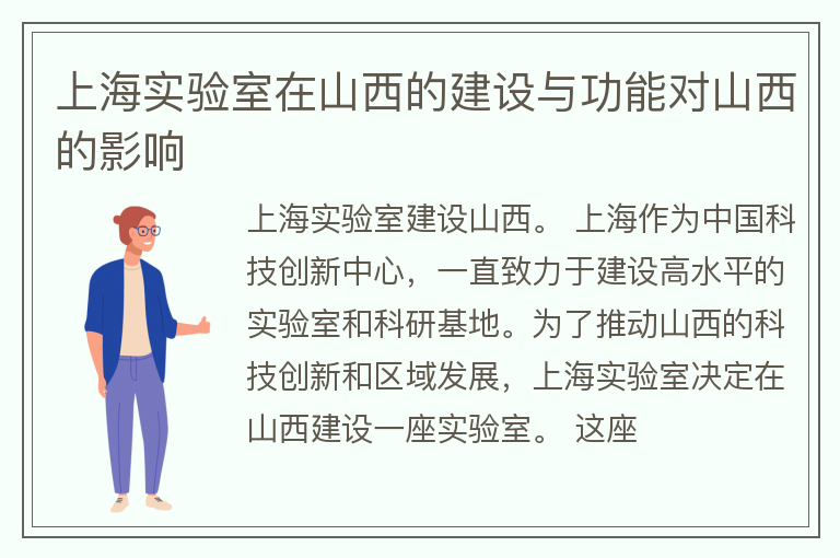 上海实验室建设山西。 上海作为中国科技创新中心,一直致力于建设高水平的实验室和科研基地。为了推动山西的科技创新和区域发展,上海实验室决定在山西建设一座实验室。 这座......【点击详情】